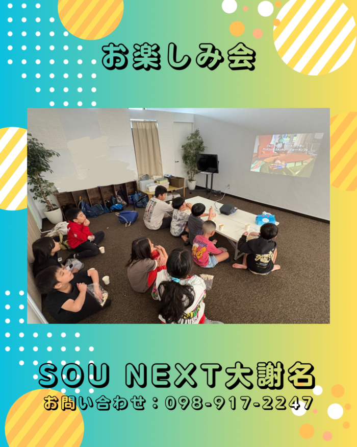 SOU BLOGSOUのブログ CATEGORY すべて SOU FIRST 志真志 SOU FIRST経塚 SOU PERSONAL 経塚 お知らせ SOU FIRST 高原 SOU FIRST 安慶名 SOU PERSONAL 北谷 SOU NEXT 大謝名 SOU NEXT 高原 SOU NEXT 海邦 事業所紹介 すべて YEAR 2025 2025 年越しそば&バルーンアート 2025/12/29 SOU NEXT 海邦 お昼ご飯クッキング 2025/12/29 SOU NEXT 大謝名 クリーン活動&おでかけ 2025/12/26 SOU NEXT 海邦 美ら海水族館へいこう🐬 2025/12/26 SOU NEXT 高原 お楽しみ会(映画鑑賞) 2025/12/26 SOU NEXT 大謝名 クリスマス会🎅 2025/12/25 SOU NEXT 高原 【SST】 2025/12/25 SOU NEXT 海邦 スポーツカリキュラム フラッグフットボール 2025/12/25 お知らせ 買い物学習🛍️ 2025/12/24 SOU NEXT 高原 クリスマスパーティー 2025/12/24 SOU NEXT 海邦 12345102030 次へ CONTACT実際に活動している様子を見学&無料体験できます! 見学&無料体験お申し込み