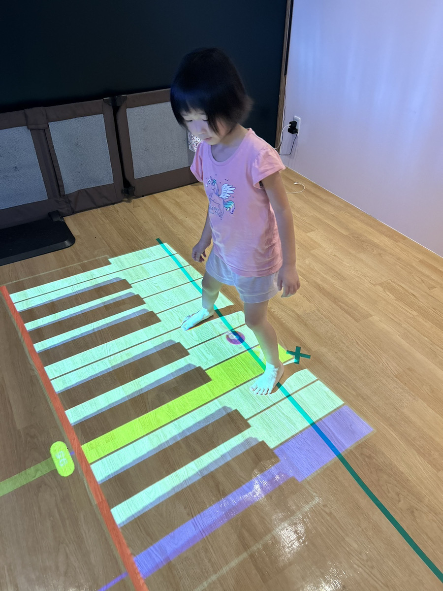 プロジェクターを使った運動療育プログラムです。壁や床に映し出される映像を目で追いながら体を動かすことで、視覚と運動の連動を強化します。さらにバランスボールなども取り入れ、体幹を楽しく鍛えることで姿勢保持や集中力の向上につながります。