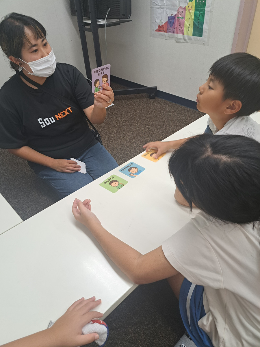 感情は日常生活の中でとても大切な役割を持っており、嬉しい・悲しい・怒りなどを適切に表現できるかどうかは、友だちとの関わりや学習への取り組みにも影響します。子どもたちは最初「どうすれば怒らずに済むのかな?」「悲しい気持ちのときはどうするのかな?」と少し戸惑う様子もありましたが、スタッフと一緒に絵カードやワークシートを使いながら、感情を言葉で表したり落ち着く方法を考えたりしました。
