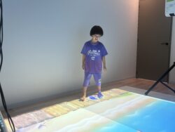 床や壁に映し出されるプロジェクションマッピングの映像に合わせて、ジャンプしたり、タッチしたり…と、まるでゲームの中に入り込んだような感覚で身体をたくさん動かしました!
