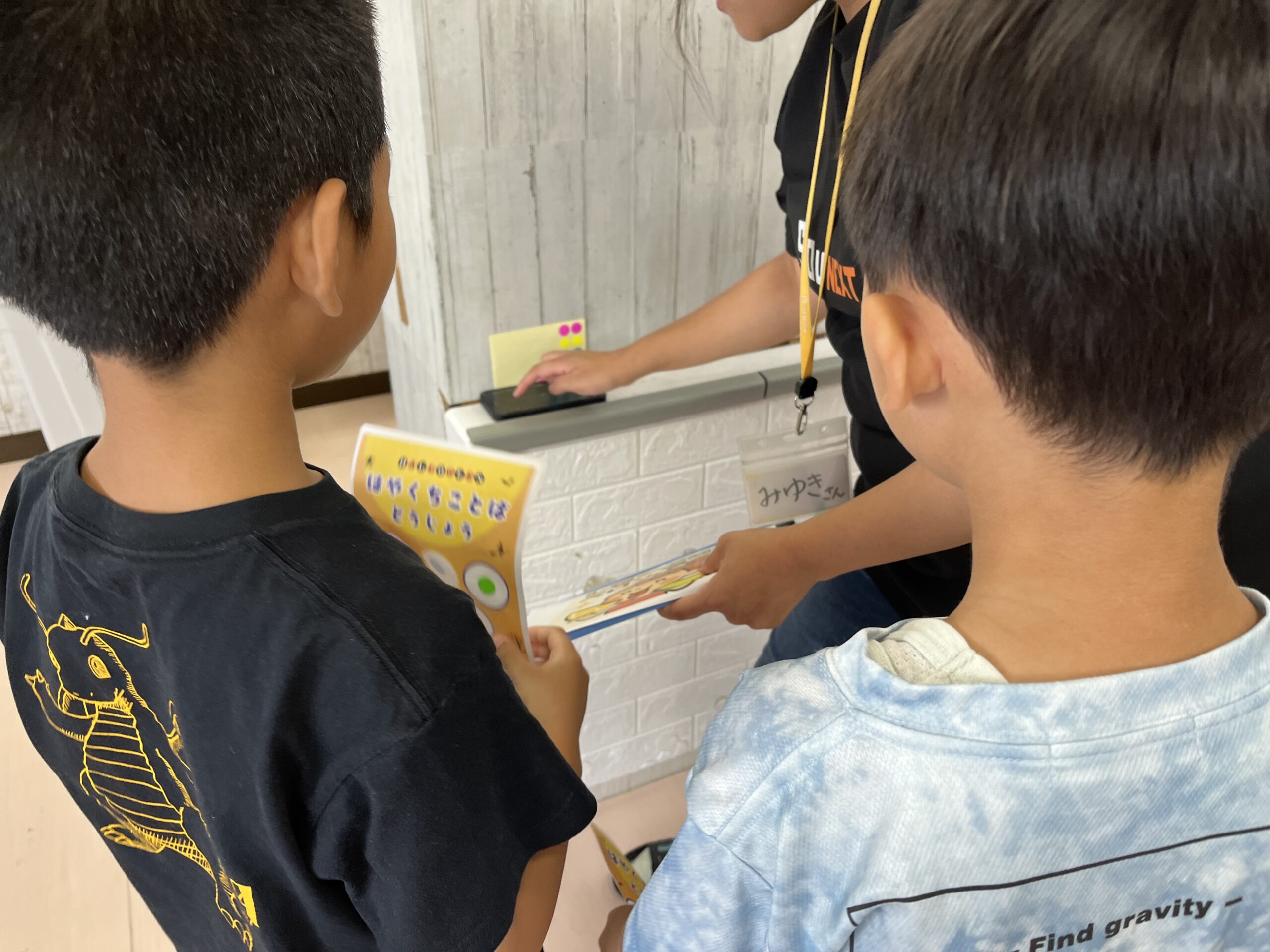 子どもたちは、スタッフが持つカードに書かれた早口言葉を1人ずつ挑戦!