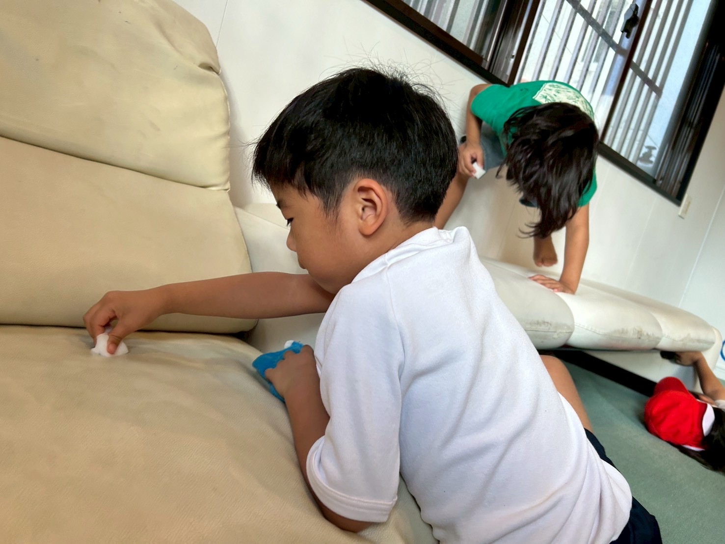 送迎車・ソファー・療育室の3つのエリアに分かれて、それぞれの場所を協力しながらお掃除😊