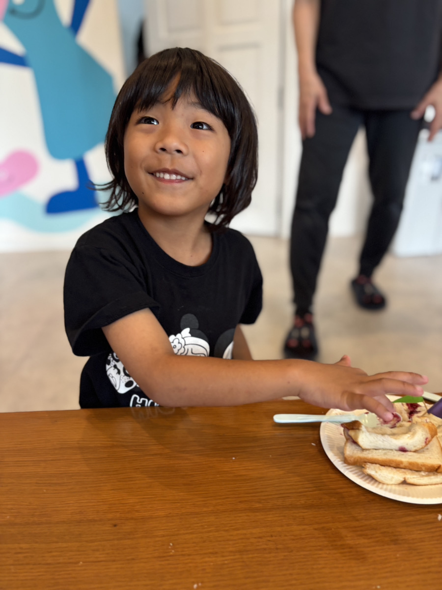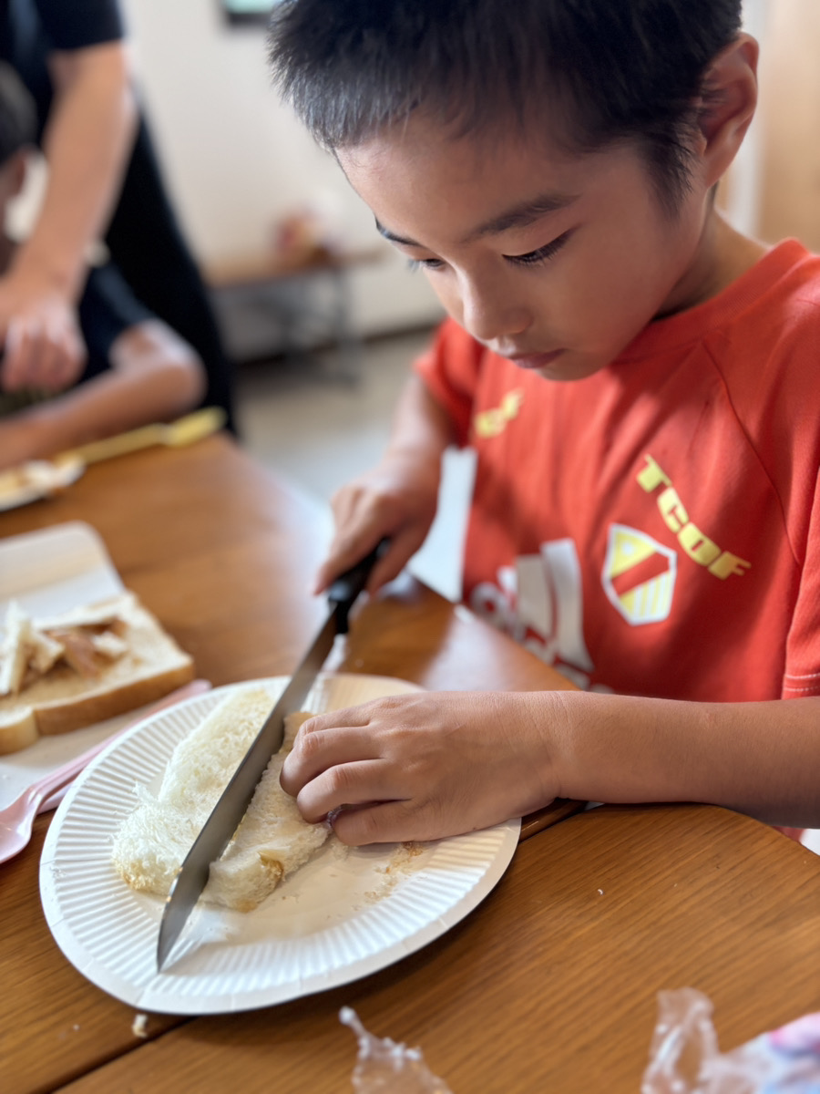 次に、パンにジャムを塗る工程では、スプーンを使って「適量」を意識しながら塗っていきます🥄 この作業は、手指の巧緻性(細かい動きの調整力)や感覚統合(視覚・触覚・運動感覚の連携)を 育む大切なトレーニングになります👐 「多すぎるとこぼれちゃう」「少ないと味がしないかも」と考えながら、ちょうどいい量を探る姿が 印象的でした✨ そして最後は、包丁を使ってパンを切る工程🔪 スタッフがしっかりサポートしながら、「猫の手」で安全に取り組みます🐾 この場面では、道具の使い方を学ぶだけでなく、手と目の協応(見ながら手を動かす力)や 集中力の向上にもつながります👁️✋ 🌈療育的なねらい この「おやつクッキング」には、以下のような療育的なねらいがあります - 🗣️ 意思決定力の育成:自分の好みを伝えることで、選択する力や自己表現力を養う - 📏 量の調整力の向上:ジャムの「適量」を考えることで、数量感覚や空間認知を育む - 💪 手指の巧緻性の強化:塗る・切るといった動作を通じて、細かい手の動きを練習 - 🌟 自己肯定感の向上:自分で作ったものを食べることで、「できた!」という達成感