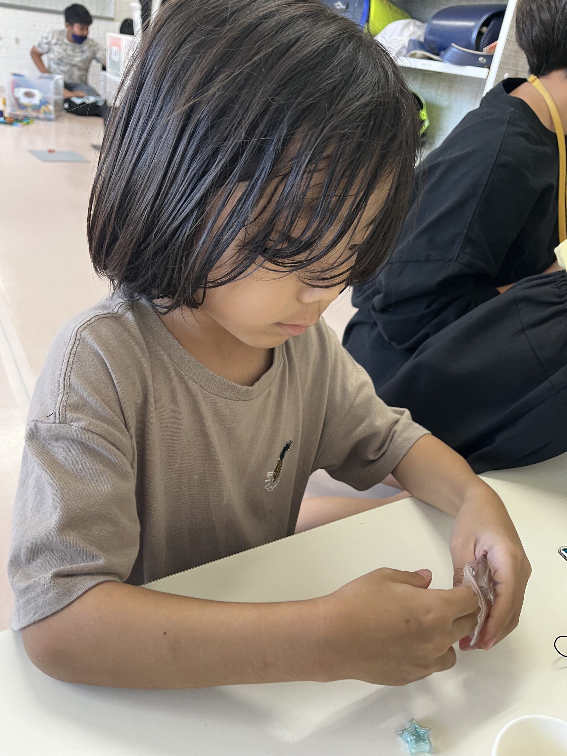 プラ板が中でぐにゃっと縮み、少しずつ固まっていく様子を見ながら、「おぉー!」「ちっちゃくなった!」と大興奮😆