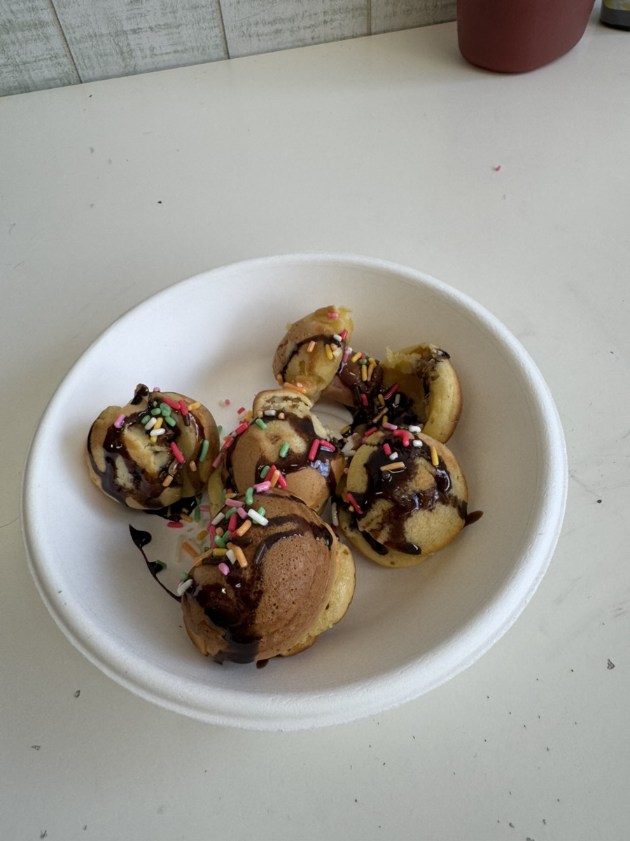 チョコソース・黒蜜・砂糖・カラースプレー・ケチャップなどの中から好きなものを選んで仕上げます🍫🌈