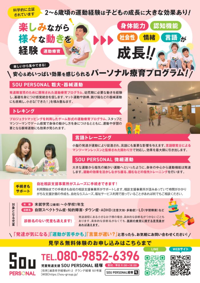 個別療育で専門的な支援を受けたい日はSOU PERSONAL経塚へ。