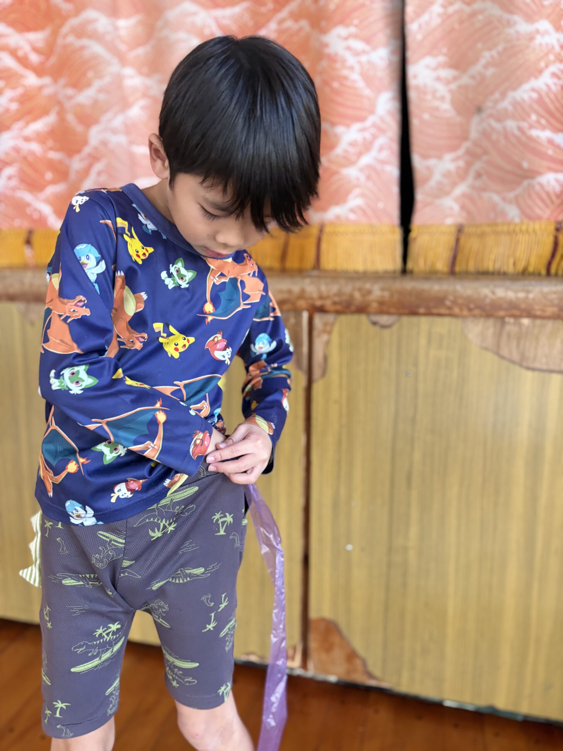 子どもたちは腰の左右にビニールテープ(タグ)をつけ、