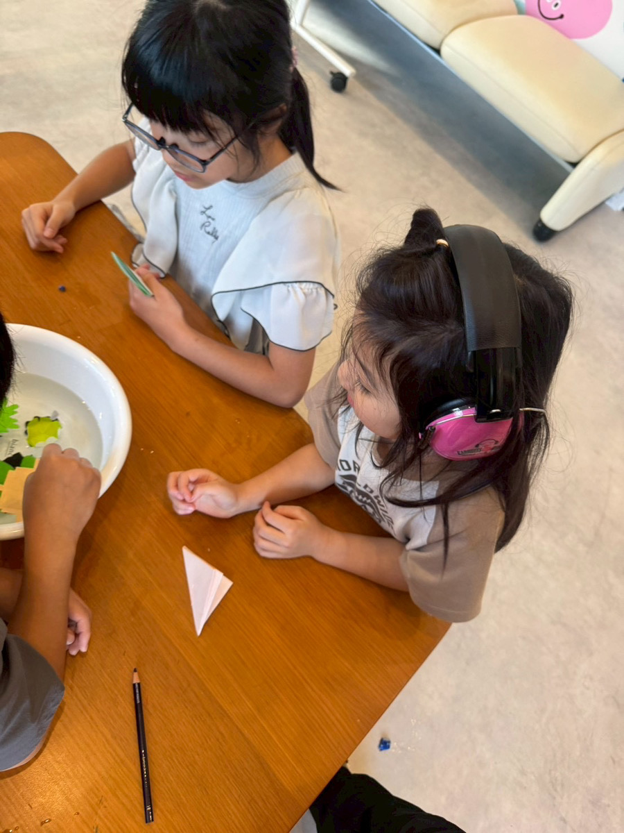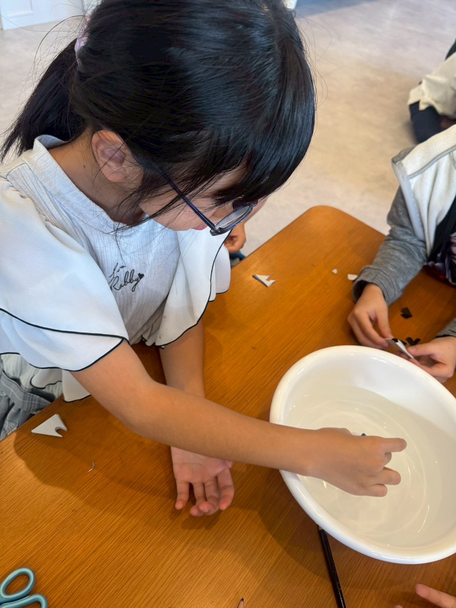 本日はサイエンスの活動として、 「水の上に咲く紙の秘密」 に取り組みました。折りたたんだ紙を水に浮かべると、 まるで花が咲くように紙がゆっくり開いていく様子に、 子どもたちは「すごい!」「なんで開くの?」と興味津々でした😊