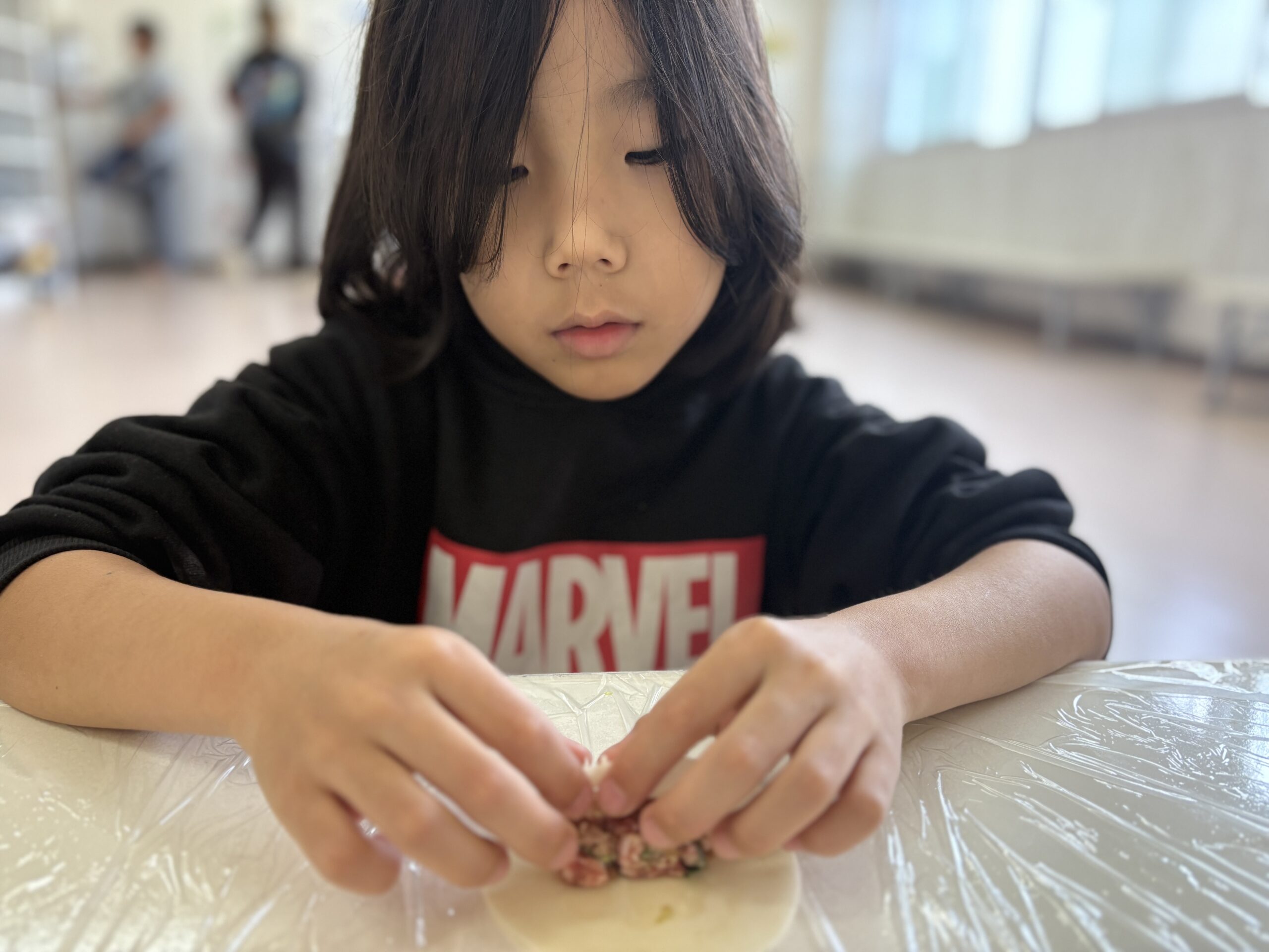 皮に具をのせて、こぼさないように包む工程に集中して取り組みました😊