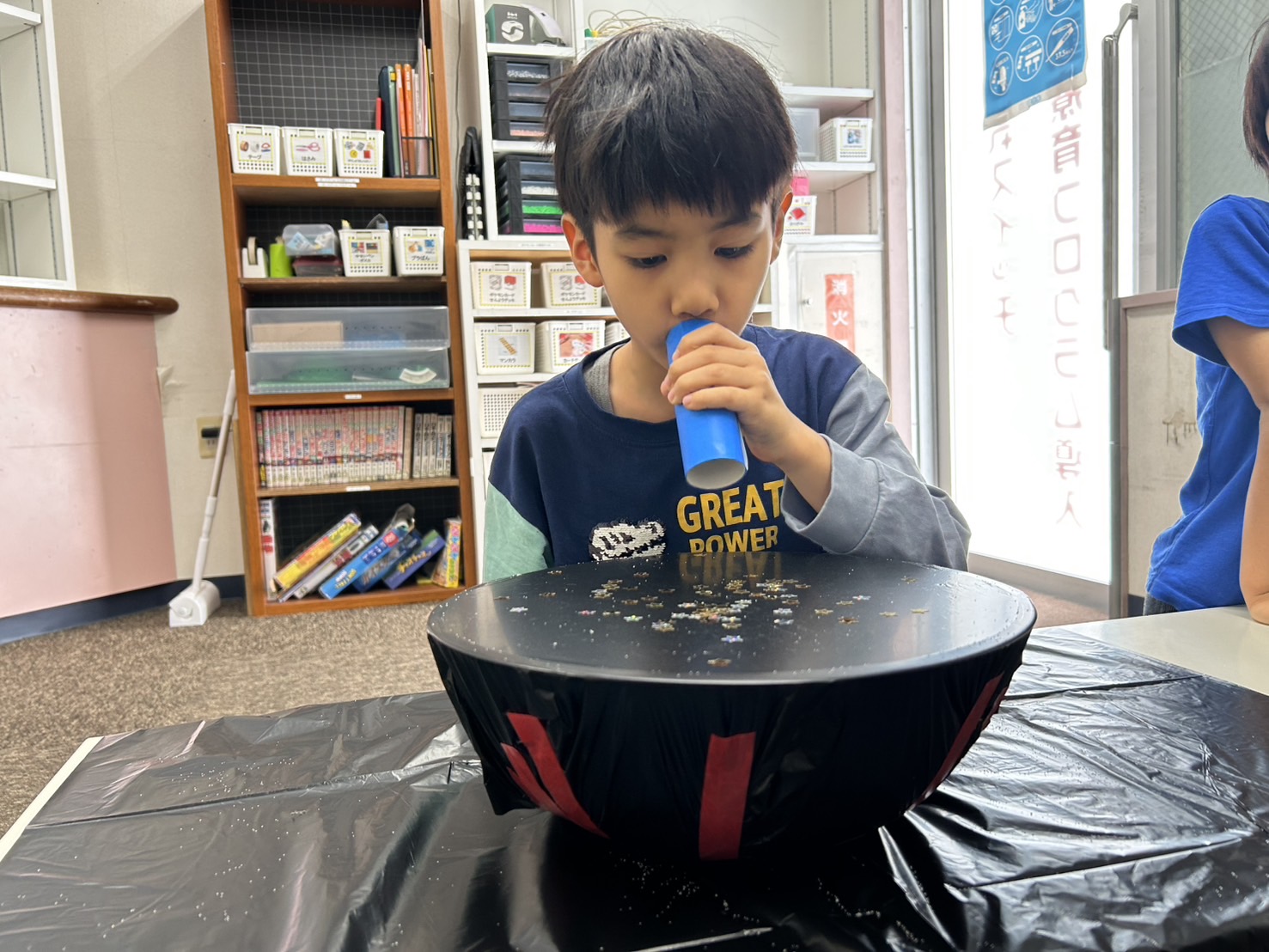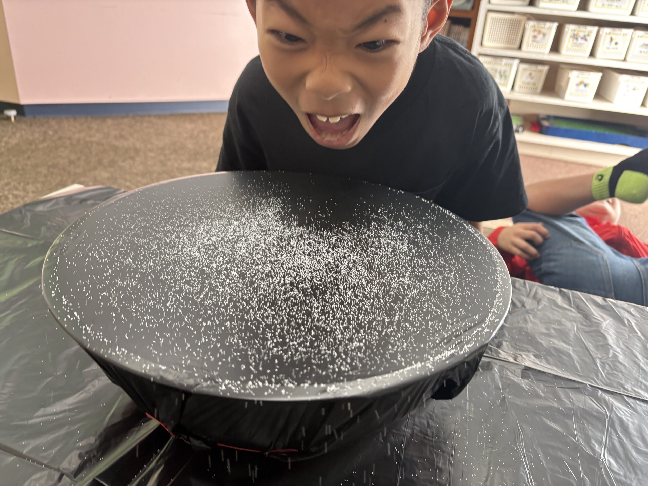 机にラップをピンと張り、その上に塩やビーズ、モール、水などを置きます。そして声を出すと…ラップが振動し、上に乗せたものが揺れたり動いたりします😲✨