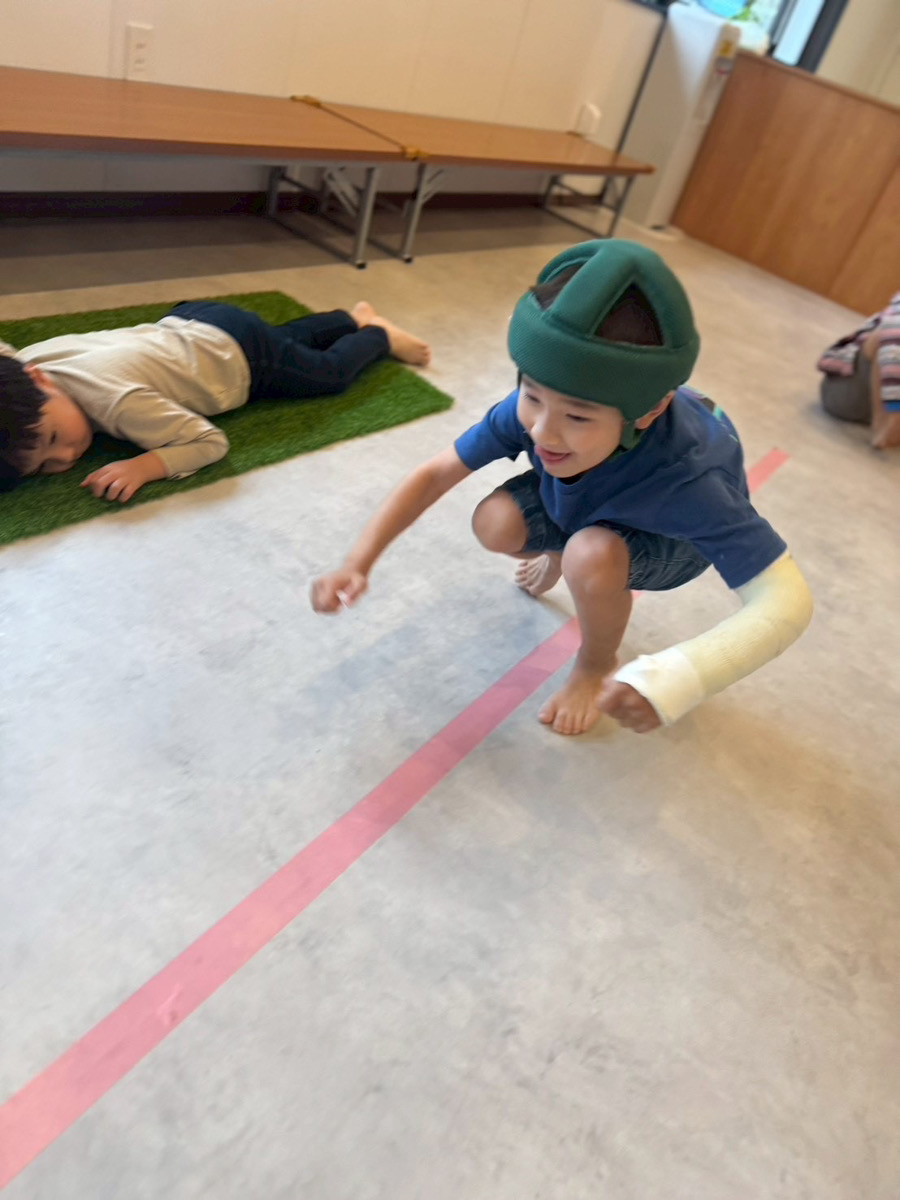 横カニ歩きでは膝を90度に曲げた姿勢を保ちながら横に歩くことを意識して取り組んでもらいました。