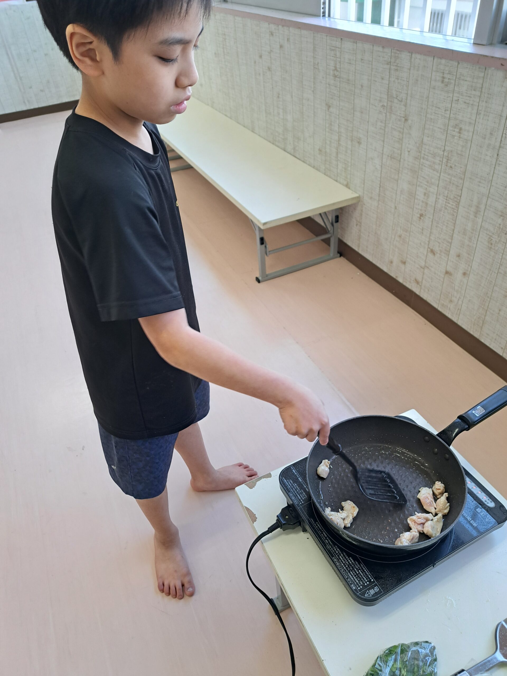 フライ返しを使って焦げ付かないように上手にお肉を炒める姿も見られ、とても丁寧に料理を進めることができていました👏