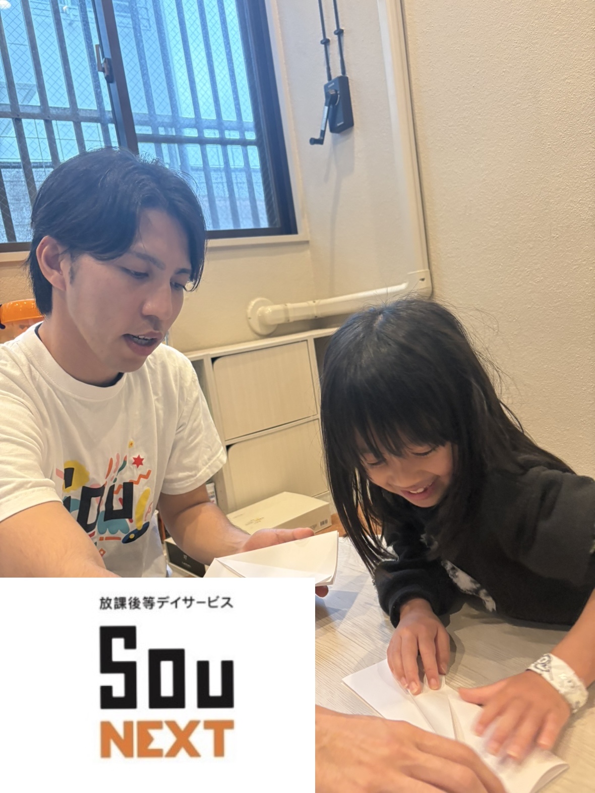 本児は最初からとても意欲的で、楽しそうに取り組む姿が見られました。言葉だけの説明では少し迷う場面もあり、手が止まってしまうこともありましたが、職員が手元で折り方を示すとすぐに理解し、そこからはスムーズに作業を進めることができました✨