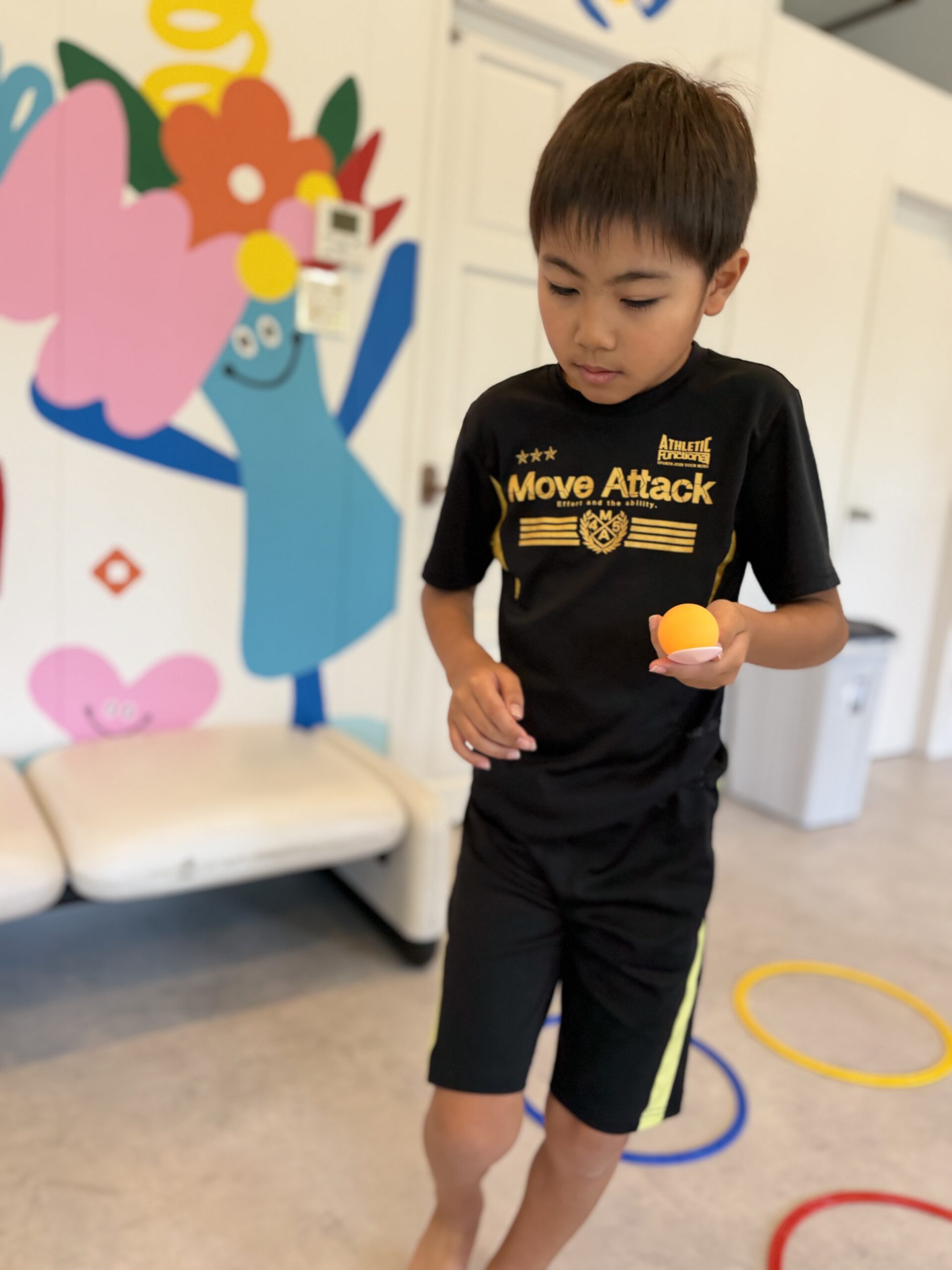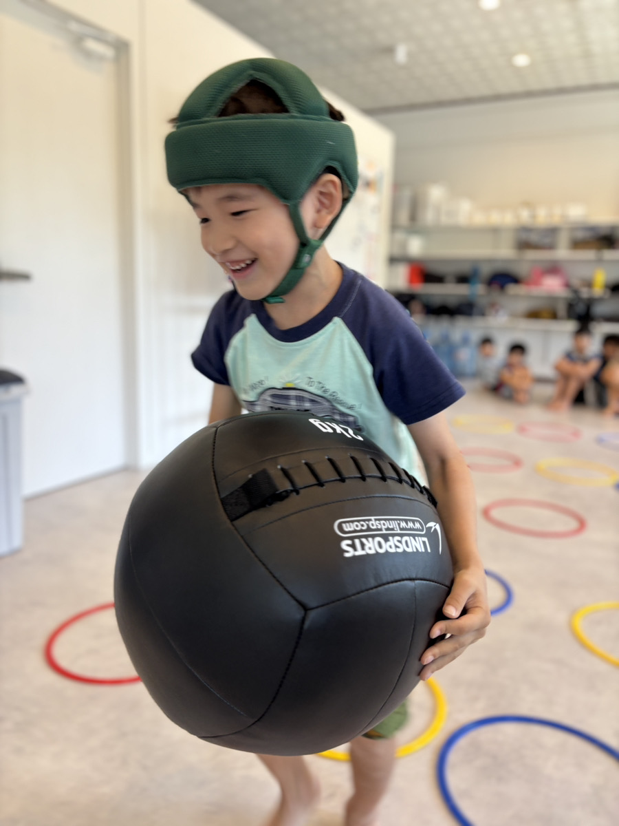 - メディシンボールを持って色の輪っかを通過💨