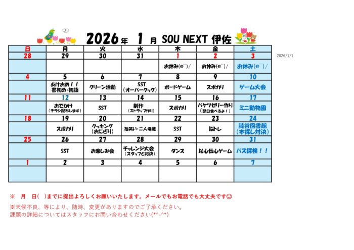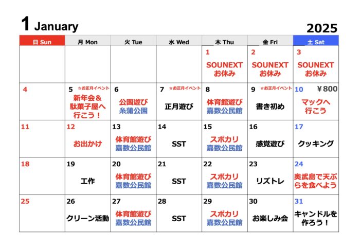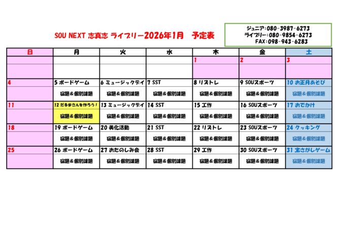 SCHEDULE月間スケジュール 事業所 すべて SOU FIRST高原SOU FIRST安慶名SOU FIRST栄野比SOU FIRST志真志SOU FIRST牧港SOU NEXT高原SOU NEXT海邦SOU NEXT 牧港SOU NEXT パーク志真志SOU VISION 志真志SOU NEXT ジュニア志真志SOU NEXT ライブリー志真志SOU NEXT 天久SOU NEXT 大謝名SOU NEXT 伊佐 (SN牧港)1月スケジュール 2025/12/18 (SN大謝名)1月スケジュール 2025/12/18 (SV志真志)1月スケジュール 2025/12/16 (SNパーク志真志)1月スケジュール 2025/12/16 (SN天久)1月スケジュール 2025/12/16 (SN高原)1月スケジュール 2025/12/16 (SN海邦)1月スケジュール 2025/12/16 (SN伊佐)1月スケジュール 2025/12/16 (SNライブリー志真志)1月スケジュール 2025/12/16 (SNパーク志真志)1月スケジュール 2025/12/16 1234510 次へ CONTACT実際に活動している様子を見学&無料体験できます! 見学&無料体験お申し込み