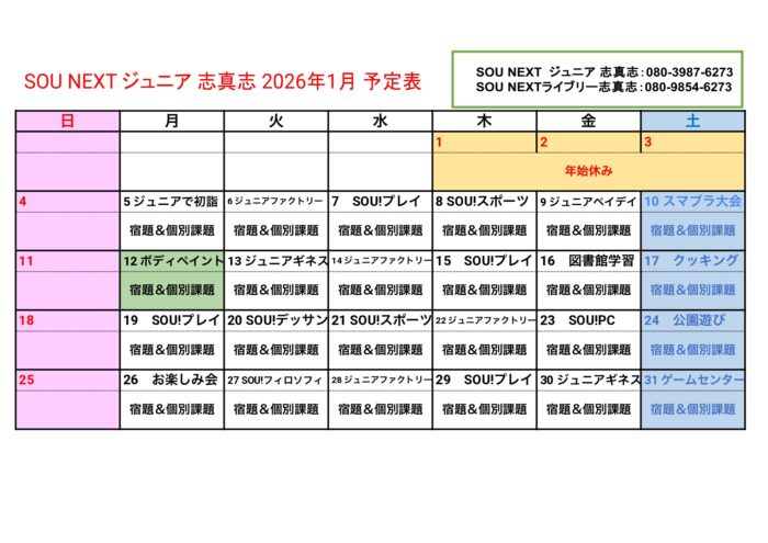 SCHEDULE月間スケジュール 事業所 すべて SOU FIRST高原SOU FIRST安慶名SOU FIRST栄野比SOU FIRST志真志SOU FIRST牧港SOU NEXT高原SOU NEXT海邦SOU NEXT 牧港SOU NEXT パーク志真志SOU VISION 志真志SOU NEXT ジュニア志真志SOU NEXT ライブリー志真志SOU NEXT 天久SOU NEXT 大謝名SOU NEXT 伊佐 (SNジュニア志真志)1月スケジュール 2025/12/16 (SF牧港)1月スケジュール 2025/12/16 (SF牧港)1月スケジュール 年長 2025/12/16 (SF志真志)1月スケジュール 2025/12/16 (SF高原)1月スケジュール 2025/12/16 (SF栄野比)1月スケジュール 2025/12/16 (SF安慶名)1月スケジュール 2025/12/16 (SNジュニア志真志)12月スケジュール 2025/11/11 (SNライブリー志真志)12月スケジュール 2025/11/11 (SN海邦)12月スケジュール 2025/11/11 前へ 1234510 次へ CONTACT実際に活動している様子を見学&無料体験できます! 見学&無料体験お申し込み