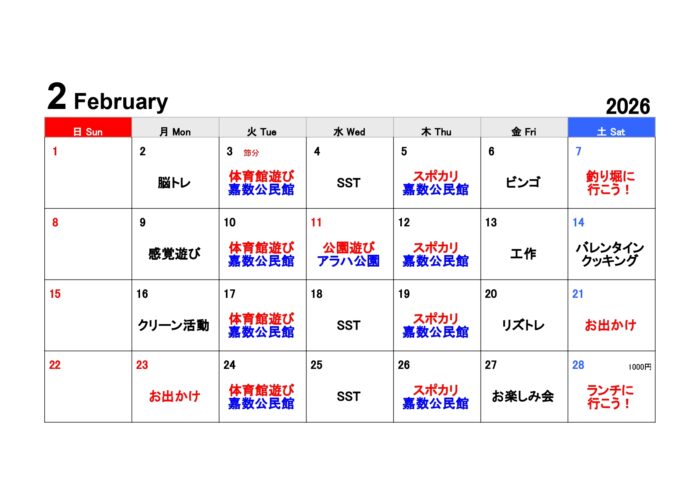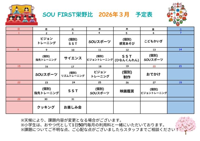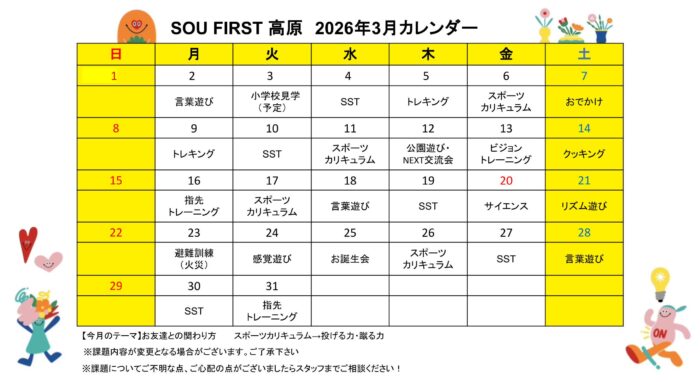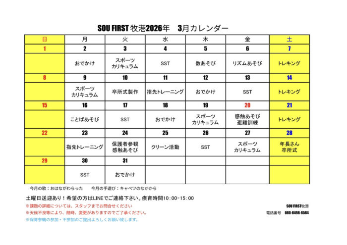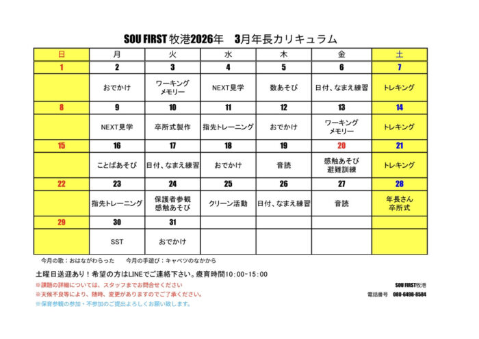 SCHEDULE月間スケジュール 事業所 すべて SOU FIRST高原SOU FIRST安慶名SOU FIRST栄野比SOU FIRST志真志SOU FIRST牧港SOU NEXT高原SOU NEXT海邦SOU NEXT 牧港SOU NEXT パーク志真志SOU VISION 志真志SOU NEXT ジュニア志真志SOU NEXT ライブリー志真志SOU NEXT 天久SOU NEXT 大謝名SOU NEXT 伊佐 (SF牧港)3月スケジュール 年長 2026/02/13 (SF牧港)3月スケジュール 2026/02/13 (SF志真志)3月スケジュール 2026/02/13 (SF高原)3月スケジュール 2026/02/13 (SF栄野比)3月スケジュール 2026/02/13 (SNライブリー志真志)2月スケジュール 2026/01/20 (SNジュニア志真志)2月スケジュール 2026/01/20 (SN大謝名)2月スケジュール 2026/01/20 (SF志真志)2月スケジュール 2026/01/20 (SF高原)2月スケジュール 2026/01/20 前へ 123451020 次へ CONTACT実際に活動している様子を見学&無料体験できます! 見学&無料体験お申し込み