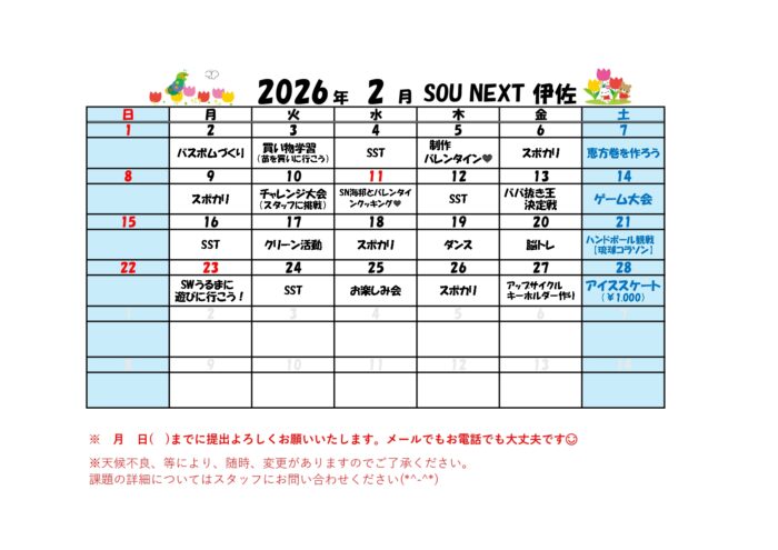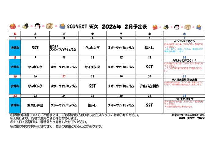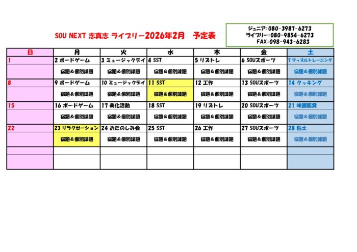 SCHEDULE月間スケジュール 事業所 すべて SOU FIRST高原SOU FIRST安慶名SOU FIRST栄野比SOU FIRST志真志SOU FIRST牧港SOU NEXT高原SOU NEXT海邦SOU NEXT 牧港SOU NEXT パーク志真志SOU VISION 志真志SOU NEXT ジュニア志真志SOU NEXT ライブリー志真志SOU NEXT 天久SOU NEXT 大謝名SOU NEXT 伊佐 (SF栄野比)2月スケジュール 2026/01/20 (SN天久)2月スケジュール 2026/01/20 (SN海邦)2月スケジュール 2026/01/20 (SF牧港)2月スケジュール 年長 2026/01/20 (SN牧港)2月スケジュール 2026/01/20 (SN高原)2月スケジュール 2026/01/20 (SNライブリー志真志)2月スケジュール 2026/01/20 (SF安慶名)2月スケジュール 2026/01/20 (SN伊佐)2月スケジュール 2026/01/20 (SNパーク志真志)2月スケジュール 2026/01/19 前へ 123451020 次へ CONTACT実際に活動している様子を見学&無料体験できます! 見学&無料体験お申し込み