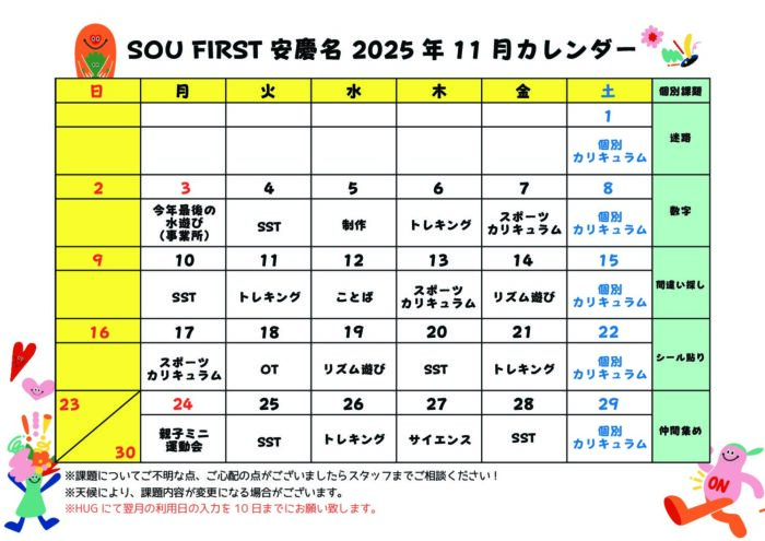 SCHEDULE月間スケジュール 事業所 SOU FIRST安慶名 SOU FIRST高原SOU FIRST安慶名SOU FIRST栄野比SOU FIRST志真志SOU FIRST牧港SOU NEXT高原SOU NEXT海邦SOU NEXT 牧港SOU NEXT パーク志真志SOU VISION 志真志SOU NEXT ジュニア志真志SOU NEXT ライブリー志真志SOU NEXT 天久SOU NEXT 大謝名SOU NEXT 伊佐 (SF安慶名)11月スケジュール 2025/10/15 (SF安慶名)10月スケジュール 2025/09/12 (SF安慶名)9月スケジュール 2025/08/16 (SF安慶名)8月スケジュール 2025/07/14 (SF安慶名)7月スケジュール 2025/06/24 (SF安慶名)6月カレンダー 2025/05/16 (SF安慶名)4月スケジュール 2025/04/10 (SF安慶名)2月スケジュール 2025/01/27 CONTACT実際に活動している様子を見学&無料体験できます! 見学&無料体験お申し込み メールでお問い合わせ LINEでお問い合わせ