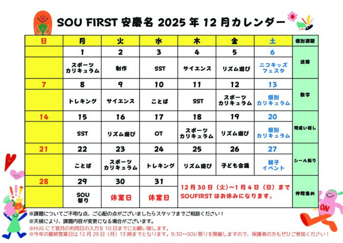 SCHEDULE月間スケジュール 事業所 SOU FIRST安慶名 SOU FIRST高原SOU FIRST安慶名SOU FIRST栄野比SOU FIRST志真志SOU FIRST牧港SOU NEXT高原SOU NEXT海邦SOU NEXT 牧港SOU NEXT パーク志真志SOU VISION 志真志SOU NEXT ジュニア志真志SOU NEXT ライブリー志真志SOU NEXT 天久SOU NEXT 大謝名SOU NEXT 伊佐 (SF安慶名)12月スケジュール 2025/11/11 (SF安慶名)11月スケジュール 2025/10/15 (SF安慶名)10月スケジュール 2025/09/12 (SF安慶名)9月スケジュール 2025/08/16 (SF安慶名)8月スケジュール 2025/07/14 (SF安慶名)7月スケジュール 2025/06/24 (SF安慶名)6月カレンダー 2025/05/16 (SF安慶名)4月スケジュール 2025/04/10 (SF安慶名)2月スケジュール 2025/01/27 CONTACT実際に活動している様子を見学&無料体験できます! 見学&無料体験お申し込み メールでお問い合わせ LINEでお問い合わせ