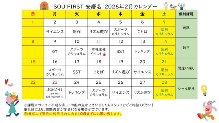 SCHEDULE月間スケジュール 事業所 SOU FIRST安慶名 SOU FIRST高原SOU FIRST安慶名SOU FIRST栄野比SOU FIRST志真志SOU FIRST牧港SOU NEXT高原SOU NEXT海邦SOU NEXT 牧港SOU NEXT パーク志真志SOU VISION 志真志SOU NEXT ジュニア志真志SOU NEXT ライブリー志真志SOU NEXT 天久SOU NEXT 大謝名SOU NEXT 伊佐 (SF安慶名)2月スケジュール 2026/01/20 (SF安慶名)1月スケジュール 2025/12/16 (SF安慶名)12月スケジュール 2025/11/11 (SF安慶名)11月スケジュール 2025/10/15 (SF安慶名)10月スケジュール 2025/09/12 (SF安慶名)9月スケジュール 2025/08/16 (SF安慶名)8月スケジュール 2025/07/14 (SF安慶名)7月スケジュール 2025/06/24 (SF安慶名)6月カレンダー 2025/05/16 (SF安慶名)4月スケジュール 2025/04/10 12 次へ CONTACT実際に活動している様子を見学&無料体験できます! 見学&無料体験お申し込み