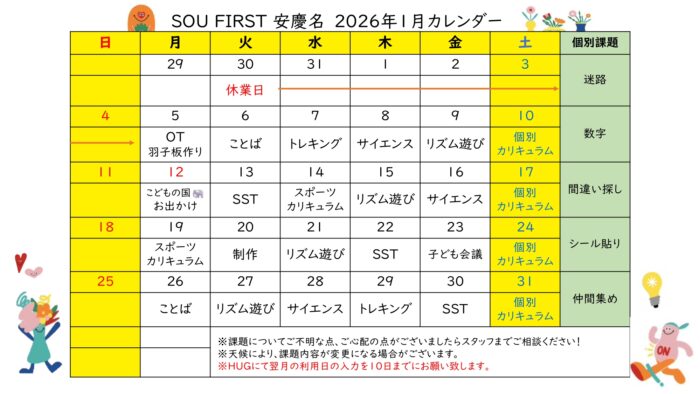 SCHEDULE月間スケジュール 事業所 SOU FIRST安慶名 SOU FIRST高原SOU FIRST安慶名SOU FIRST栄野比SOU FIRST志真志SOU FIRST牧港SOU NEXT高原SOU NEXT海邦SOU NEXT 牧港SOU NEXT パーク志真志SOU VISION 志真志SOU NEXT ジュニア志真志SOU NEXT ライブリー志真志SOU NEXT 天久SOU NEXT 大謝名SOU NEXT 伊佐 (SF安慶名)1月スケジュール 2025/12/16 (SF安慶名)12月スケジュール 2025/11/11 (SF安慶名)11月スケジュール 2025/10/15 (SF安慶名)10月スケジュール 2025/09/12 (SF安慶名)9月スケジュール 2025/08/16 (SF安慶名)8月スケジュール 2025/07/14 (SF安慶名)7月スケジュール 2025/06/24 (SF安慶名)6月カレンダー 2025/05/16 (SF安慶名)4月スケジュール 2025/04/10 (SF安慶名)2月スケジュール 2025/01/27 CONTACT実際に活動している様子を見学&無料体験できます! 見学&無料体験お申し込み メールでお問い合わせ LINEでお問い合わせ