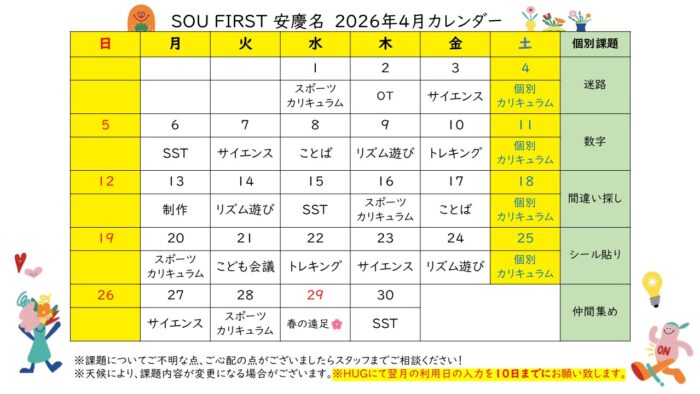 SCHEDULE月間スケジュール 事業所 SOU FIRST安慶名 SOU FIRST高原SOU FIRST安慶名SOU FIRST栄野比SOU FIRST志真志SOU FIRST牧港SOU NEXT高原SOU NEXT海邦SOU NEXT 牧港SOU NEXT パーク志真志SOU VISION 志真志SOU NEXT ジュニア志真志SOU NEXT ライブリー志真志SOU NEXT 天久SOU NEXT 大謝名SOU NEXT 伊佐 (SF安慶名)4月スケジュール 2026/03/13 (SF安慶名)3月スケジュール 2026/02/13 (SF安慶名)2月スケジュール 2026/01/20 (SF安慶名)1月スケジュール 2025/12/16 (SF安慶名)12月スケジュール 2025/11/11 (SF安慶名)11月スケジュール 2025/10/15 (SF安慶名)10月スケジュール 2025/09/12 (SF安慶名)9月スケジュール 2025/08/16 (SF安慶名)8月スケジュール 2025/07/14 (SF安慶名)7月スケジュール 2025/06/24 12 次へ CONTACT実際に活動している様子を見学&無料体験できます! 見学&無料体験お申し込み