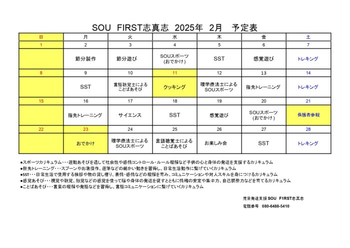 SCHEDULE月間スケジュール 事業所 SOU FIRST志真志 SOU FIRST高原SOU FIRST安慶名SOU FIRST栄野比SOU FIRST志真志SOU FIRST牧港SOU NEXT高原SOU NEXT海邦SOU NEXT 牧港SOU NEXT パーク志真志SOU VISION 志真志SOU NEXT ジュニア志真志SOU NEXT ライブリー志真志SOU NEXT 天久SOU NEXT 大謝名SOU NEXT 伊佐 (SF志真志)2月スケジュール 2026/01/20 (SF志真志)1月スケジュール 2025/12/16 (SF志真志)12月スケジュール 2025/11/10 (SF志真志)12月スケジュール年長 2025/11/10 (SF志真志)11月スケジュール 2025/10/15 (SF志真志)11月スケジュール 年長 2025/10/15 (SF志真志)10月スケジュール年長 2025/09/12 (SF志真志)10月スケジュール 2025/09/12 (SF志真志)年長カレンダー 2025/08/16 (SF志真志)9月スケジュール 2025/08/16 123 次へ CONTACT実際に活動している様子を見学&無料体験できます! 見学&無料体験お申し込み