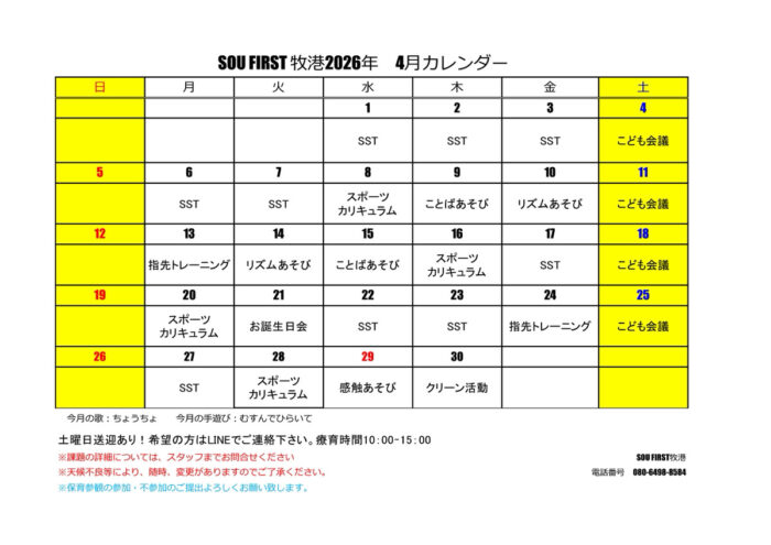 SCHEDULE月間スケジュール 事業所 SOU FIRST牧港 SOU FIRST高原SOU FIRST安慶名SOU FIRST栄野比SOU FIRST志真志SOU FIRST牧港SOU NEXT高原SOU NEXT海邦SOU NEXT 牧港SOU NEXT パーク志真志SOU VISION 志真志SOU NEXT ジュニア志真志SOU NEXT ライブリー志真志SOU NEXT 天久SOU NEXT 大謝名SOU NEXT 伊佐 (SF牧港)4月スケジュール 2026/03/13 (SF牧港)3月スケジュール 年長 2026/02/13 (SF牧港)3月スケジュール 2026/02/13 (SF牧港)2月スケジュール 年長 2026/01/20 (SF牧港)1月スケジュール 2025/12/16 (SF牧港)1月スケジュール 年長 2025/12/16 (SF牧港)12月スケジュール 2025/11/11 (SF牧港)12月スケジュール 年長 2025/11/11 (SF牧港)11月スケジュール 年長 2025/10/15 (SF牧港)11月スケジュール 2025/10/15 12 次へ CONTACT実際に活動している様子を見学&無料体験できます! 見学&無料体験お申し込み