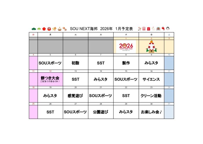 SCHEDULE月間スケジュール 事業所 SOU NEXT海邦 SOU FIRST高原SOU FIRST安慶名SOU FIRST栄野比SOU FIRST志真志SOU FIRST牧港SOU NEXT高原SOU NEXT海邦SOU NEXT 牧港SOU NEXT パーク志真志SOU VISION 志真志SOU NEXT ジュニア志真志SOU NEXT ライブリー志真志SOU NEXT 天久SOU NEXT 大謝名SOU NEXT 伊佐 (SN海邦)1月スケジュール 2025/12/16 (SN海邦)12月スケジュール 2025/11/11 (SN海邦)11月スケジュール 2025/10/15 (SN海邦)10月スケジュール 2025/09/12 (SN海邦)9月スケジュール 2025/08/16 (SN海邦)8月スケジュール 2025/07/14 (SN海邦)7月スケジュール 2025/06/24 (SN海邦)6月スケジュール 2025/05/15 (SN海邦)5月スケジュール 2025/04/21 (SN海邦)4月スケジュール 2025/03/18 CONTACT実際に活動している様子を見学&無料体験できます! 見学&無料体験お申し込み メールでお問い合わせ LINEでお問い合わせ