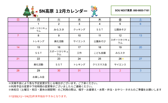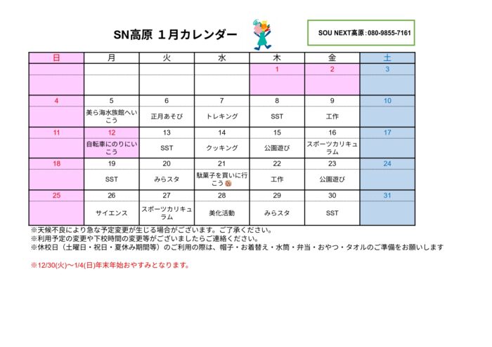 SCHEDULE月間スケジュール 事業所 SOU NEXT高原 SOU FIRST高原SOU FIRST安慶名SOU FIRST栄野比SOU FIRST志真志SOU FIRST牧港SOU NEXT高原SOU NEXT海邦SOU NEXT 牧港SOU NEXT パーク志真志SOU VISION 志真志SOU NEXT ジュニア志真志SOU NEXT ライブリー志真志SOU NEXT 天久SOU NEXT 大謝名SOU NEXT 伊佐 (SN高原)1月スケジュール 2025/12/16 (SN高原)12月スケジュール 2025/11/10 (SN高原)11月スケジュール 2025/10/15 (SN高原)10月スケジュール 2025/09/12 (SN高原)9月スケジュール 2025/08/29 (SN高原)8月スケジュール 2025/07/14 (SN高原)7月スケジュール 2025/06/27 (SN高原)6月スケジュール 2025/05/15 (SN高原)5月スケジュール 2025/04/21 (SN高原)4月スケジュール 2025/03/18 CONTACT実際に活動している様子を見学&無料体験できます! 見学&無料体験お申し込み メールでお問い合わせ LINEでお問い合わせ