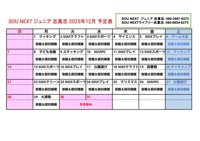 SCHEDULE月間スケジュール 事業所 SOU NEXT ジュニア志真志 SOU FIRST高原SOU FIRST安慶名SOU FIRST栄野比SOU FIRST志真志SOU FIRST牧港SOU NEXT高原SOU NEXT海邦SOU NEXT 牧港SOU NEXT パーク志真志SOU VISION 志真志SOU NEXT ジュニア志真志SOU NEXT ライブリー志真志SOU NEXT 天久SOU NEXT 大謝名SOU NEXT 伊佐 (SNジュニア志真志)12月スケジュール 2025/11/11 (SN ジュニア志真志)11月スケジュール 2025/10/15 (SNジュニア志真志)10月スケジュール 2025/09/12 (SNジュニア志真志)9月スケジュール 2025/08/16 (SNジュニア志真志)8月スケジュール 2025/07/14 (SN志真志ジュニア)7月スケジュール 2025/06/24 (SNジュニア志真志)6月スケジュール 2025/05/15 (SN志真志)5月スケジュール ジュニア 2025/04/21 CONTACT実際に活動している様子を見学&無料体験できます! 見学&無料体験お申し込み メールでお問い合わせ LINEでお問い合わせ