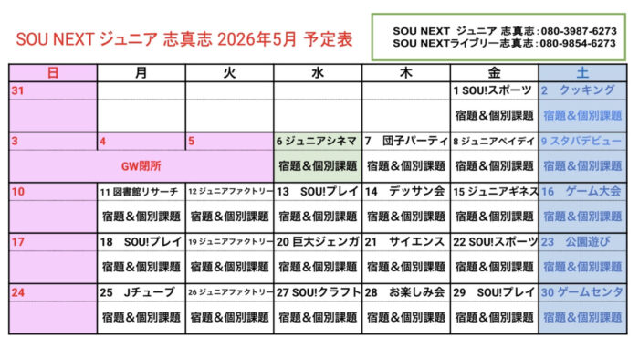 SCHEDULE月間スケジュール 事業所 SOU NEXT ジュニア志真志 SOU FIRST高原SOU FIRST安慶名SOU FIRST栄野比SOU FIRST志真志SOU FIRST牧港SOU NEXT高原SOU NEXT海邦SOU NEXT 牧港SOU NEXT パーク志真志SOU VISION 志真志SOU NEXT ジュニア志真志SOU NEXT ライブリー志真志SOU NEXT 天久SOU NEXT 大謝名SOU NEXT 伊佐 (SNジュニア志真志)5月スケジュール 2026/04/18 (SNジュニア志真志)4月スケジュール 2026/03/13 (SNジュニア志真志)3月スケジュール 2026/02/13 (SNジュニア志真志)2月スケジュール 2026/01/20 (SNジュニア志真志)1月スケジュール 2025/12/16 (SNジュニア志真志)12月スケジュール 2025/11/11 (SN ジュニア志真志)11月スケジュール 2025/10/15 (SNジュニア志真志)10月スケジュール 2025/09/12 (SNジュニア志真志)9月スケジュール 2025/08/16 (SNジュニア志真志)8月スケジュール 2025/07/14 12 次へ CONTACT実際に活動している様子を見学&無料体験できます! 見学&無料体験お申し込み
