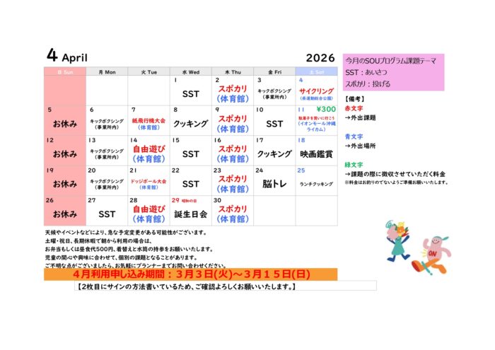 SCHEDULE月間スケジュール 事業所 SOU NEXT 天久 SOU FIRST高原SOU FIRST安慶名SOU FIRST栄野比SOU FIRST志真志SOU FIRST牧港SOU NEXT高原SOU NEXT海邦SOU NEXT 牧港SOU NEXT パーク志真志SOU VISION 志真志SOU NEXT ジュニア志真志SOU NEXT ライブリー志真志SOU NEXT 天久SOU NEXT 大謝名SOU NEXT 伊佐 (SN天久)4月スケジュール 2026/03/13 (SN天久)3月スケジュール 2026/02/13 (SN天久)2月スケジュール 2026/01/20 (SN天久)1月スケジュール 2025/12/16 (SN天久)12月スケジュール 2025/11/10 (SN天久)11月スケジュール 2025/10/15 (SN天久)10月スケジュール 2025/09/12 (SN天久)9月スケジュール 2025/08/16 (SN天久)8月スケジュール 2025/07/14 (SN天久)7月スケジュール 2025/06/24 12 次へ CONTACT実際に活動している様子を見学&無料体験できます! 見学&無料体験お申し込み
