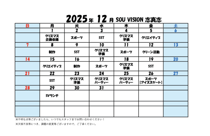 SCHEDULE月間スケジュール 事業所 SOU VISION 志真志 SOU FIRST高原SOU FIRST安慶名SOU FIRST栄野比SOU FIRST志真志SOU FIRST牧港SOU NEXT高原SOU NEXT海邦SOU NEXT 牧港SOU NEXT パーク志真志SOU VISION 志真志SOU NEXT ジュニア志真志SOU NEXT ライブリー志真志SOU NEXT 天久SOU NEXT 大謝名SOU NEXT 伊佐 (SV志真志)12月スケジュール 2025/11/10 (SV志真志)11月スケジュール 2025/10/17 (SV志真志)10月スケジュール 2025/09/12 (SV志真志) 9月スケジュール 2025/08/21 (SV志真志)8月スケジュール 2025/07/14 (SV志真志)7月スケジュール 2025/06/27 (SV志真志)6月カレンダー 2025/05/16 (SV志真志)5月スケジュール 2025/04/21 (SV志真志)4月スケジュール 2025/03/18 CONTACT実際に活動している様子を見学&無料体験できます! 見学&無料体験お申し込み メールでお問い合わせ LINEでお問い合わせ